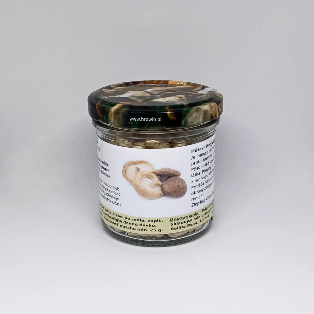 1 kapsula rastlinného pôvodu obsahuje 150 mg 100% čistého prášku sušenej huby SHII-TAKE (Lentinula edodes) bez prímesí.